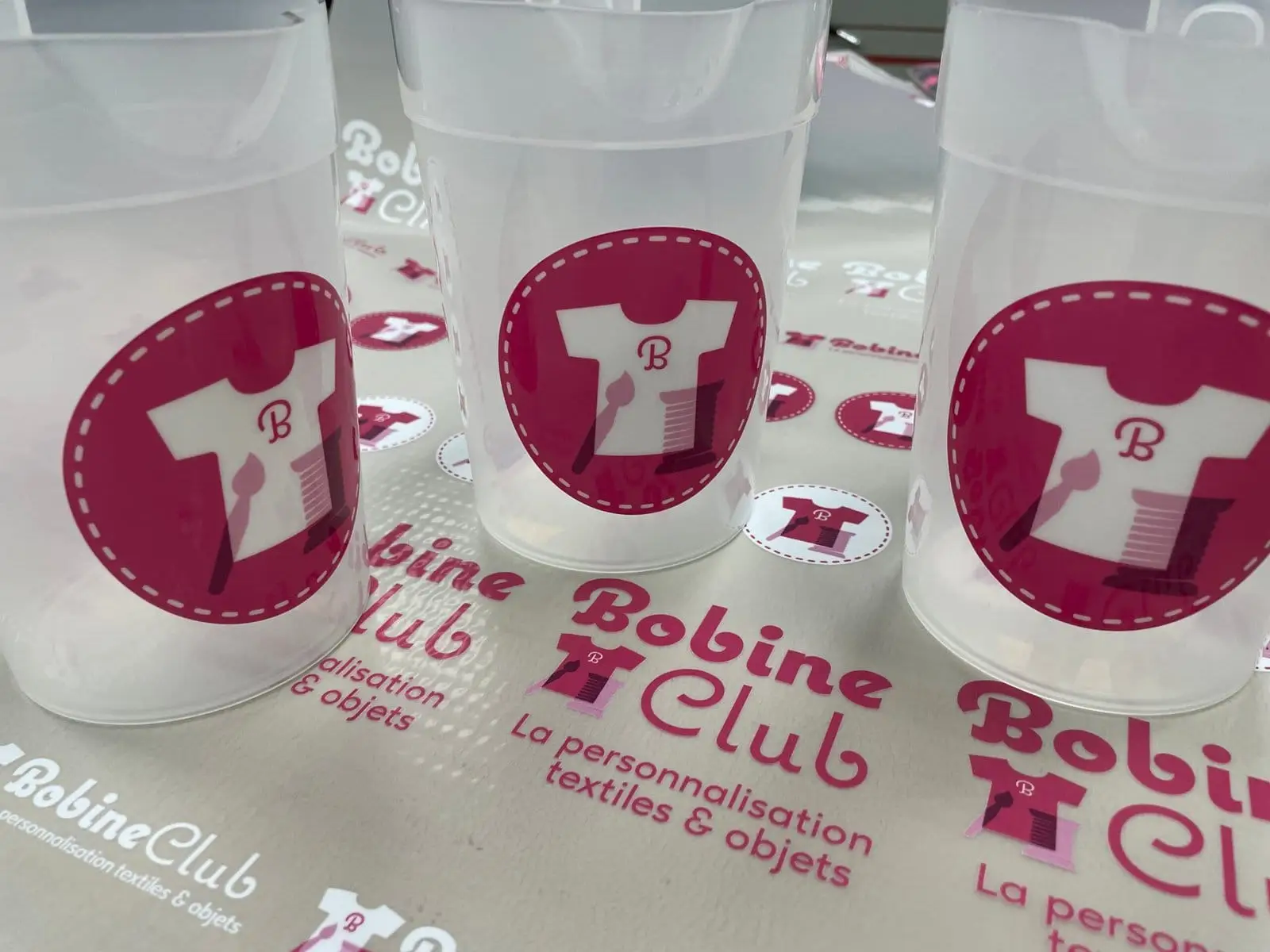 Produit testé sur gobelets, carnets, gourdes, machines de production, ordinateurs